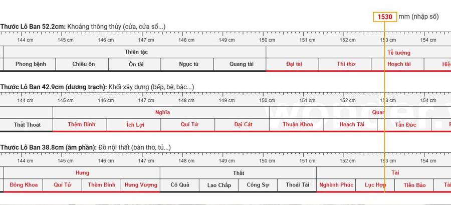 Nếu vạch kích thước rơi vào khoảng màu đen, đó là cung Xấu, bạn nên tránh và dịch chuyển kích thước một chút (tăng lên hoặc giảm đi) để vào khoảng màu đỏ gần nhất.