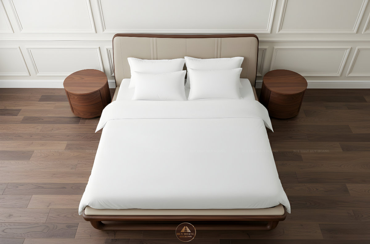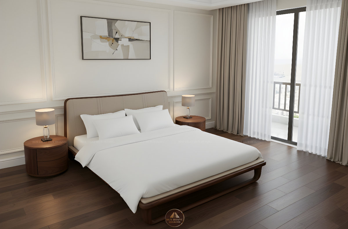 - Thiết kế chân giường liền khối uốn cong mềm mại là một trong những chi tiết thể hiện tay nghề tinh xảo của thợ mộc Huy Hoàng. Kiểu dáng này không chỉ tăng tính thẩm mỹ mà còn giúp giường trở nên nhẹ nhàng, thoáng khí, dễ vệ sinh và đảm bảo độ bền vững cao.