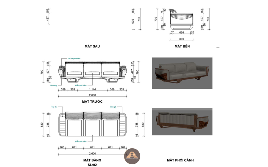 1. Kích thước sofa gỗ óc chó phổ biến hiện nay