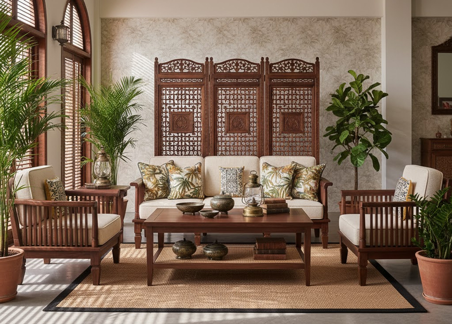 Phần đệm ngồi thường bọc vải hoặc da cao cấp, sử dụng tông màu kem, be, hoặc xám trung tính, tạo sự hài hòa và trang nhã. Khi bố trí trong không gian có tường sơn trắng, sàn gỗ tự nhiên hoặc gạch bông cổ điển, bộ sofa Indochine trở thành điểm nhấn tinh tế, thể hiện gu thẩm mỹ tinh tế và sự am hiểu văn hóa của gia chủ.