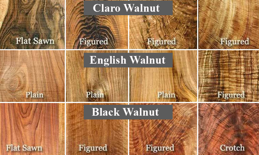 Dựa vào bảng màu có thể thấy gỗ óc chó tự nhiên đến từ khu vực Bắc Mỹ (Black Walnut) có màu trầm, đậm hơn hẳn so với hai vùng còn lại. Gỗ óc chó châu Âu (English Walnut) có màu nhạt nhất trong ba loại. Gỗ óc chó Claro tuy màu sắc đậm hơn nhưng hệ vân gỗ của cây gỗ óc chó ở đây không được sắc nét bằng Bắc Mỹ. Qua đó, ta thấy gỗ óc chó từ khu vực Bắc Mỹ có chất lượng về thẩm mỹ tuyệt vời, màu sắc trầm ấm sang trọng, đường vân gỗ uyển chuyển ấn tượng. Đây cũng là loại gỗ óc chó có giá thành cao nhất trong các loại. Mọi người tham khảo bảng màu để lựa chọn loại gỗ phù hợp với sở thích cá nhân cũng như tình hình tài chính đầu tư nội thất cho không gian sống.
