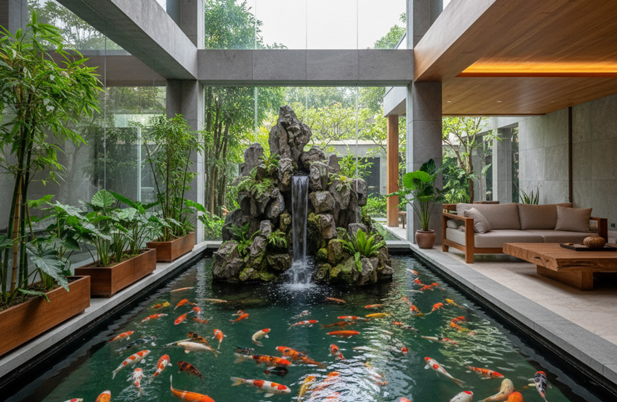 - Hồ cá Koi, hòn non bộ, thác nước: Yếu tố nước không chỉ mang lại sinh khí mà còn là điểm nhấn thị giác đắt giá khi nhìn từ bên trong.