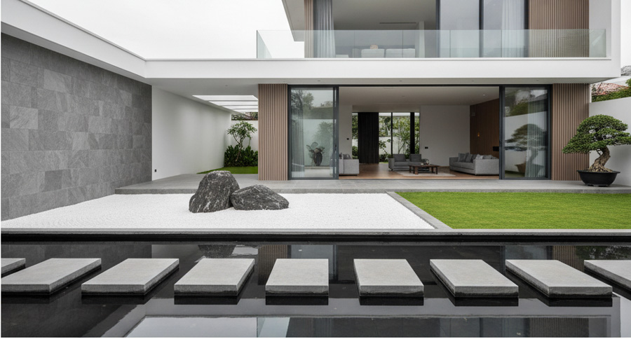 - Thiết kế cảnh quan sân vườn kiểu Nhật: Đề cao sự tinh tế, thiền định với các yếu tố đá, sỏi, nước và cây bonsai. Phong cách này kết hợp hoàn hảo với không gian nội thất tối giản, sử dụng vật liệu tự nhiên.