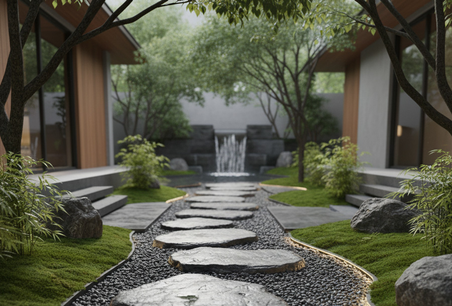 - Thiết kế lối đi sân vườn bằng sỏi, đá: Không chỉ phục vụ việc đi lại, lối đi còn là những đường nét dẫn dắt ánh mắt, tạo chiều sâu cho khu vườn.