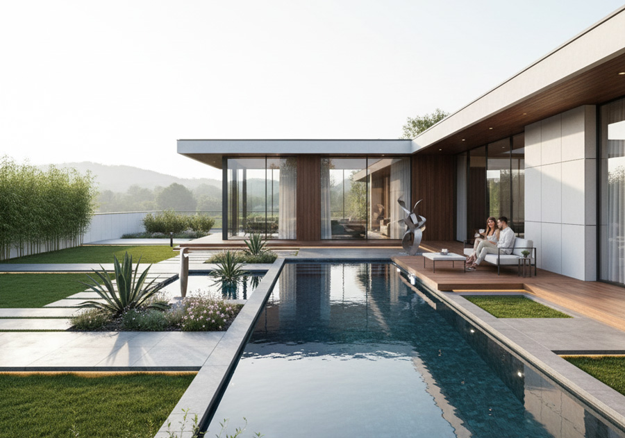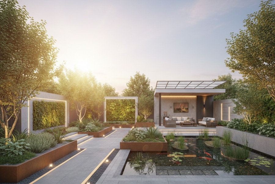 - Thiết kế cảnh quan hiện đại: Tập trung vào đường nét hình học, mảng khối rõ ràng, sử dụng vật liệu như bê tông, thép Corten. Phong cách này yêu cầu một không gian nội thất tương xứng về sự tối giản và sang trọng.