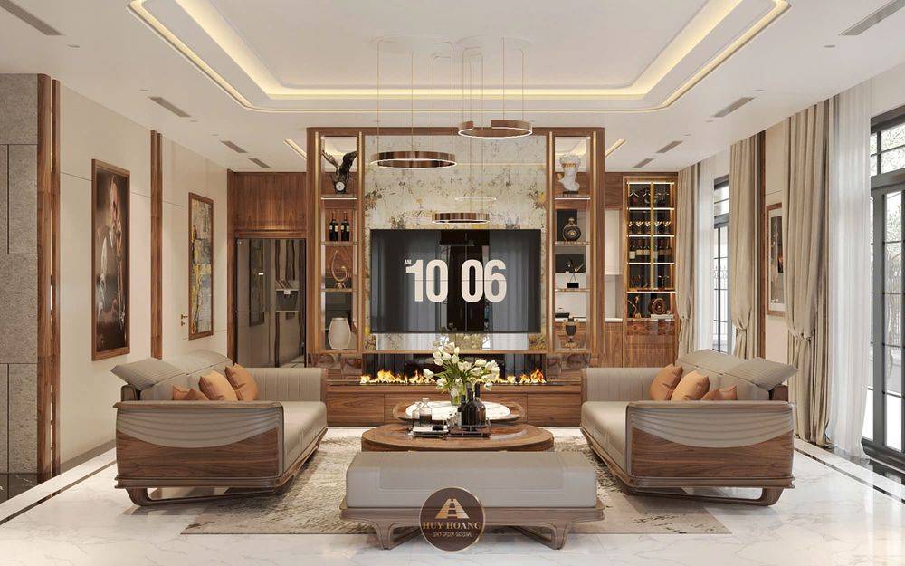 Phòng khách: Thiết kế không gian mở, điểm nhấn là bộ sofa bọc da cao cấp, vách ngăn gỗ óc chó được gia công tinh xảo, kết hợp hệ thống giải trí hiện đại và lò sưởi ảo mang lại vẻ ấm cúng, sang trọng.
