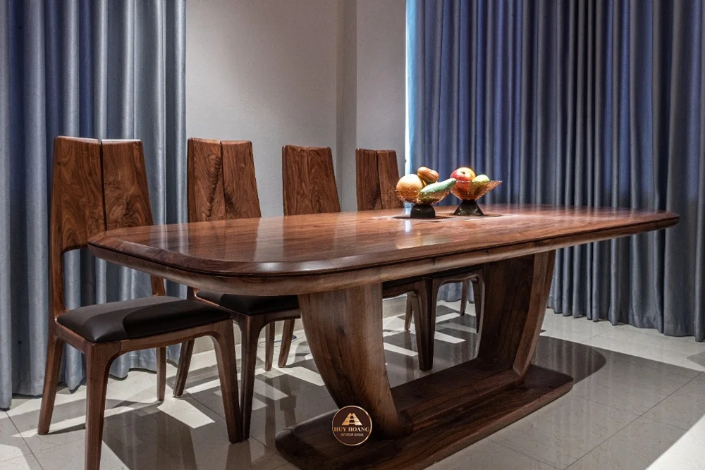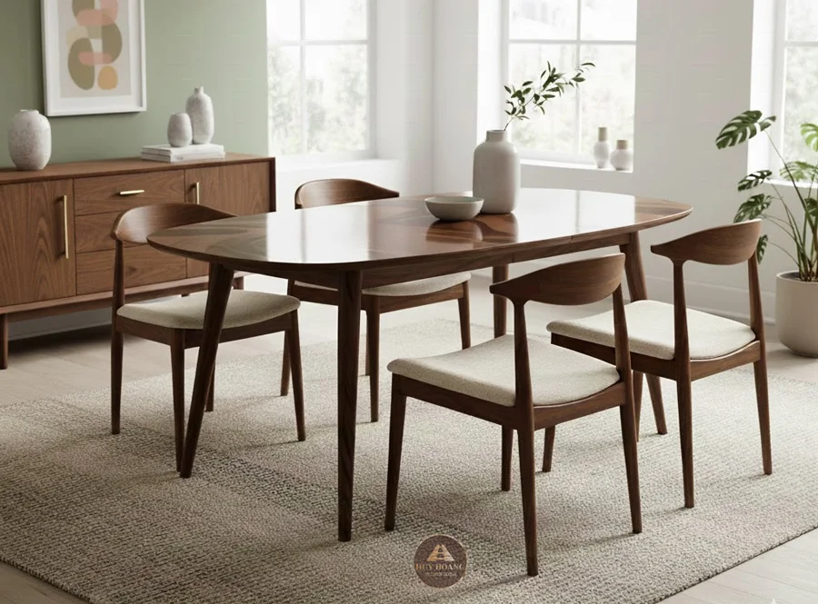 Lời khuyên từ kiến trúc sư: Nếu phòng ăn của bạn có diện tích khiêm tốn (như chung cư studio), bạn nên ưu tiên chọn bàn chữ nhật 120 cm với thiết kế chân thanh mảnh để không gian trông rộng rãi hơn. Ngược lại, nếu phòng ăn rộng, bạn có thể chọn mẫu bàn 140 cm chân thuyền để khoe trọn vẻ đẹp đẳng cấp của gỗ óc chó.