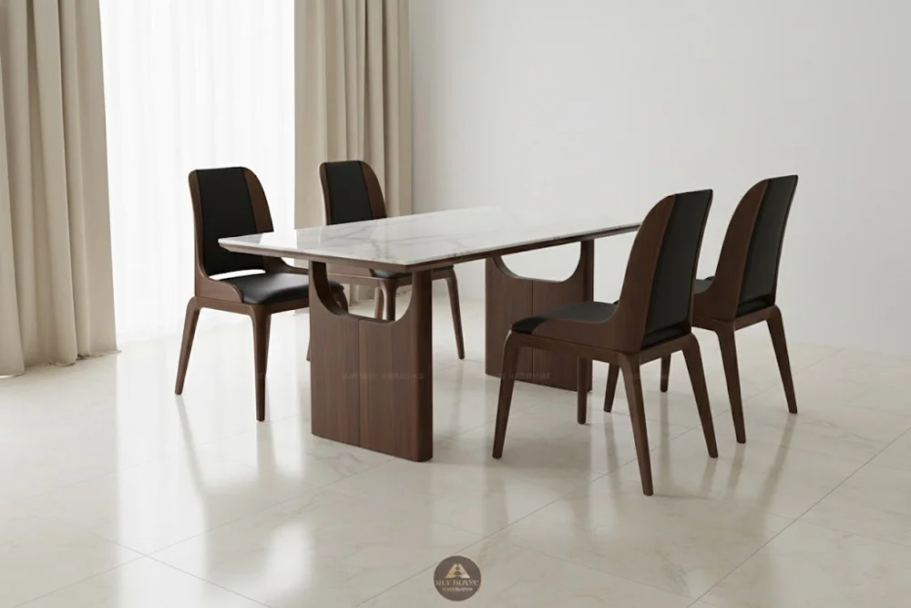 Một xu hướng rất mạnh trong năm nay. Mặt đá (thường là đá cẩm thạch hoặc đá nhân tạo cao cấp) giúp bàn ăn trông hiện đại, dễ lau chùi và tạo độ tương phản bắt mắt với khung gỗ tối màu.
