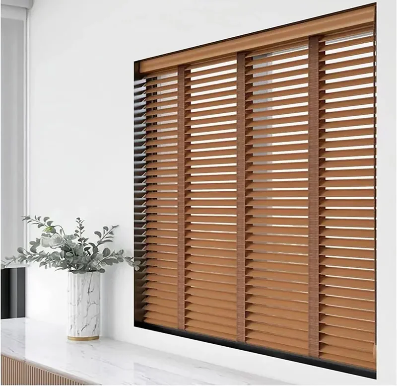 Sử dụng rèm sáo gỗ: Đối với những ô cửa sổ nhỏ, rèm sáo gỗ màu kem sáng hoặc màu nâu trầm (tương đồng với màu óc chó) là một ý tưởng tuyệt vời. Rèm sáo màu nâu trầm cực kỳ phù hợp với các không gian mang phong cách Indochine (Đông Dương) hoặc Wabi-Sabi, tạo nên sự liên kết vật liệu liền mạch với khung ghế.