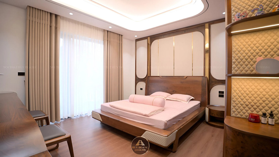 - Phòng ngủ Master và phòng ông bà: Trung thành với phong cách gỗ óc chó sang trọng, ấm cúng.