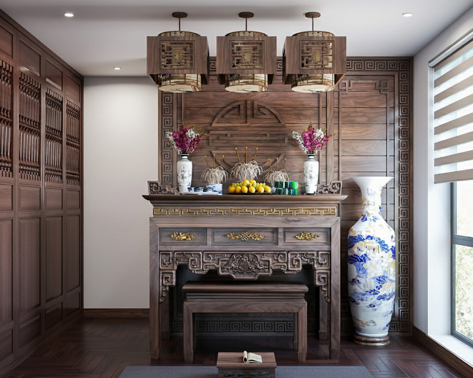 Đối với một số gia chủ có thể sắp xếp không gian thờ cúng ở tầng một ngay gian chính, nơi trang trọng nhất trong căn nhà là cách mà nhiều gia đình trước đây chọn lựa. Cách này sẽ thuận tiện lau chùi và hương khói sẽ được nhiều gia chủ lựa chọn và trang trí các vách ngăn, đồ thờ khác kèm theo góp phần tạo nên một không gian thanh lịch, trang nghiêm. Ngoài ra, một số gia chủ khác lại bố trí bàn thờ gỗ óc chó trên tầng cao đảm bảo yên tĩnh cũng như tránh được việc người ngoài nhìn thấy hết các đồ lễ hay bài vị trên bàn thờ gia tiên, thần Phật…